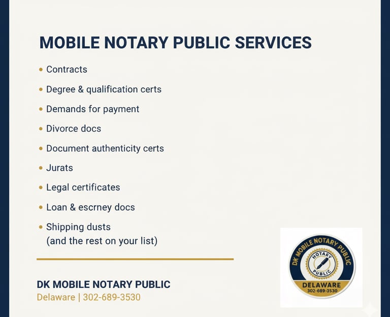 Get in touch with DK Mobile Notary Public Services-DE for convenient professional notary public services at your home, office, or a public venue. We offer end-to-end notary public, document pick up, and delivery carrier services.